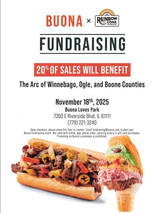 Join us at Buona Beef in Loves Park on Tuesday, November 18, 2025, and enjoy a meal that makes a difference! When you mention The Arc while ordering, a portion of your purchase will go directly to support The Arc of Winnebago, Boone, and Ogle Counties.