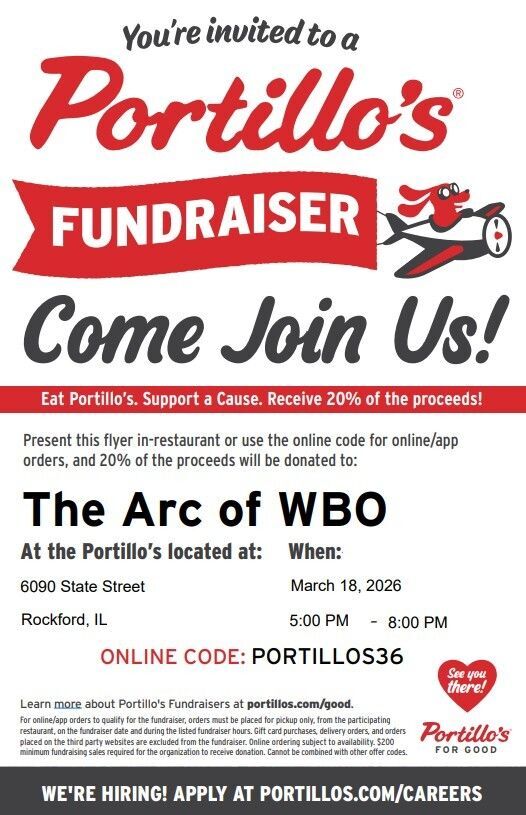 Join us for a Portillo’s Fundraiser benefiting The Arc of Winnebago, Boone, and Ogle Counties on Wednesday, March 18, 2026, from 5:00 to 8:00 PM at the Portillo’s located at 6090 State Street in Rockford.